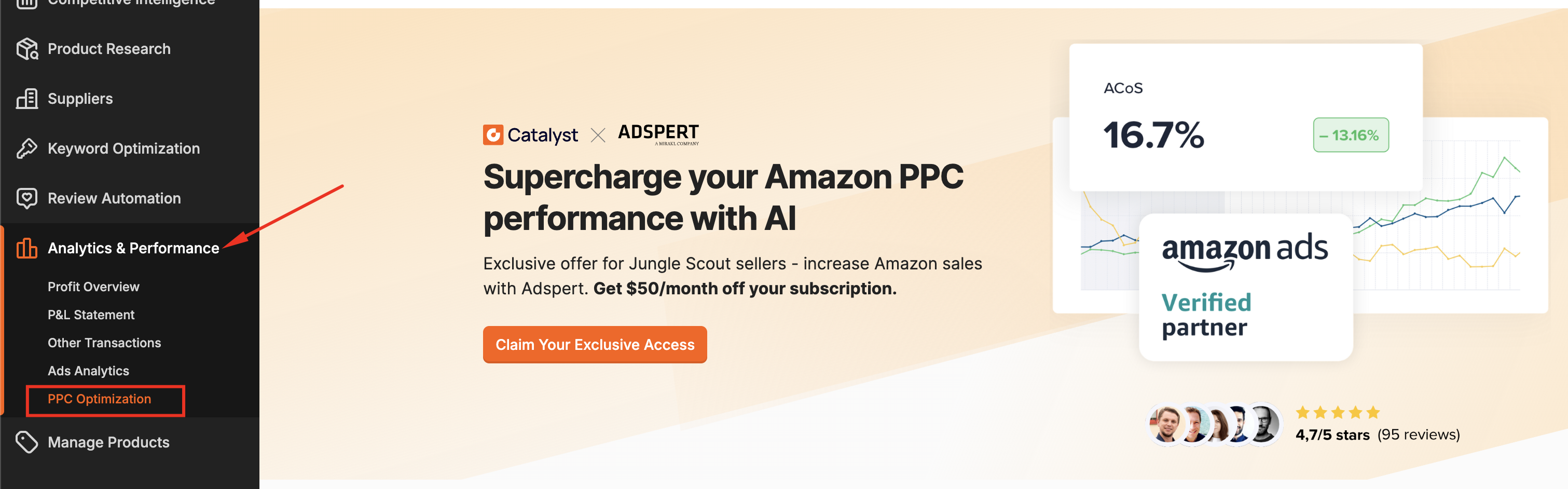 To claim that discount, head to the Analytics & Performance section in Jungle Scout, and then click "PPC Optimization":